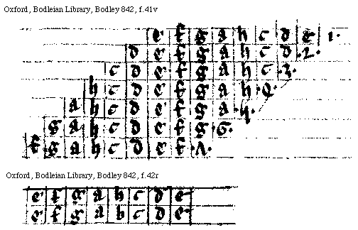 [Oxford, Bodleian Library, Bodley 842, f.42r; text: e, f, g, a, [sqb], c, d, [roe], b]