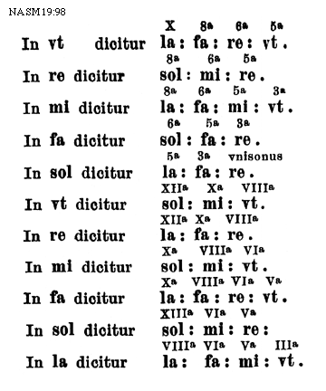 [NASM19:98; text: In vt dicitur la: fa: re: vt. In re dicitur sol: mi: re. In mi dicitur la: fa: mi: vt. In fa dicitur sol: fa: re. In sol dicitur la: fa: re. In vt dicitur sol: mi: vt. In re dicitur la: fa: re. In mi dicitur sol: mi: vt. In fa dicitur la: fa: re: vt. In sol dicitur sol: mi: re: In la dicitur la: fa: mi vt. X, octaua, sexta, quinta, tertia, vnisonus, duodecima, decima, decimatertia]