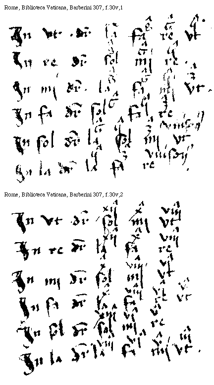 [Rome, Biblioteca Apostolica Vaticana, Barberini 307, f.30v,1; text: In vt dicitur la, fa, re, sol, mi, vnisonus, tercia, quinta, sexta, octaua, decima]