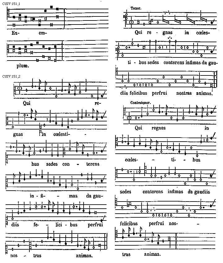 [CSIV:151,2; text: Qui regnas in coelestibus sedes conterens infimas da gaudiis felicibus perfrui nostras animas. Tenor. Contratenor.]