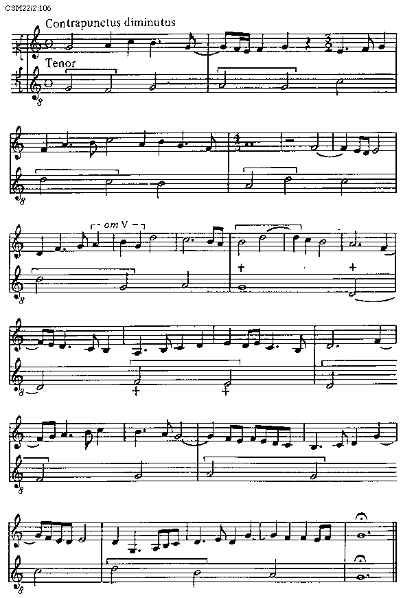 [106]Diminutus autem contrapunctus ille est qui per positionem duarum aut plurium notarum contra unam, nunc per proportionem aequalitatis, nunc inaequalitatis conficitur, ut hic: