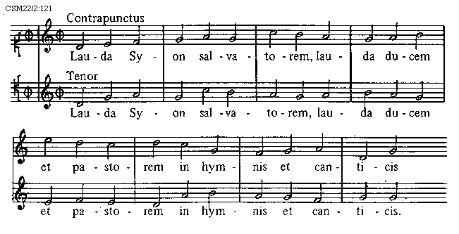 [CSM22/2:121; text: Contrapunctus, Lauda Syon salvatorem, lauda ducem et pastorem in hymnis et canticis, Tenor]