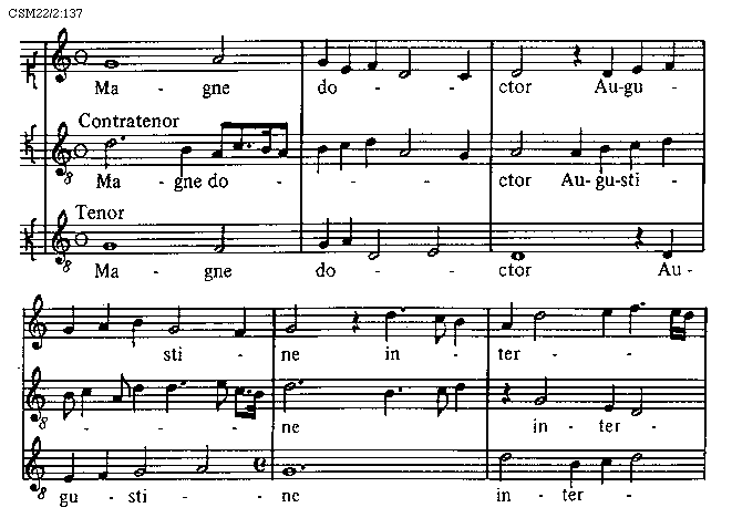 [CSM22/2:137; text: Contratenor, Tenor, Magne doctor Augustine inter-]