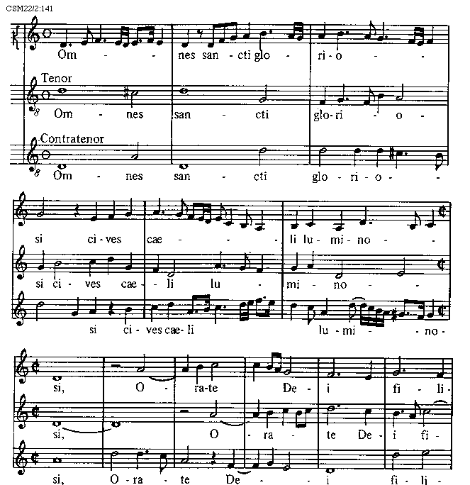 [CSM22/2:141; text: Tenor, Contratenor, Omnes sancti gloriosi cives caeli luminosi, Orate Dei fili-]