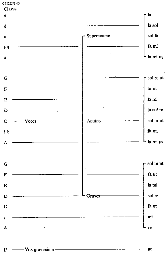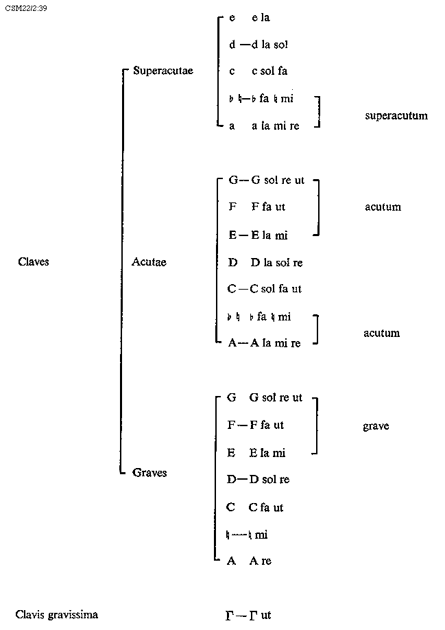 [39][CSM22/2:39; text: Claves, Superacutae, Acutae, Graves, e, e la, d--d la sol, c, c sol fa, [rob] [sqb]--[rob] fa [sqb] mi, a, a la mi re, superacutum, G--G sol re ut, F, F fa ut, E--E la mi, acutum, D, D la sol re, C--C sol fa ut, [rob] [sqb], [rob] fa [sqb] mi, A--A la mi re, G, G sol re ut, F--F fa ut, E, E la mi, grave, D--D sol re, C, C fa ut, [sqb]--[sqb] mi, A, A re, Clavis gravissima, [Gamma]--[Gamma] ut]