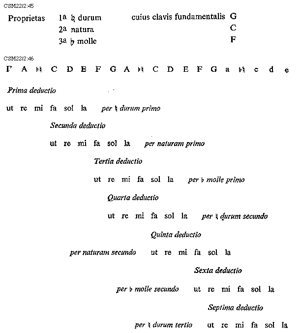 Omnisque descensus aut fit de natura in [sqb] durum, aut de [sqb] molli in naturam, aut de [sqb] duro in naturam, aut de [sqb] duro in [rob] molle, aut de [rob] molli in [sqb] durum, aut de natura in [rob] molle. Et quamvis, ut praemisimus, decem et octo mutationes universales tantummodo sint, tamen eo quod omnes, licet aliae plus aliae minus, propter multitudinem locorum, vocum et deductionum nostrae manus reiterentur, quinquaginta duae mutationes in ipsa manu nostra inveniuntur.
