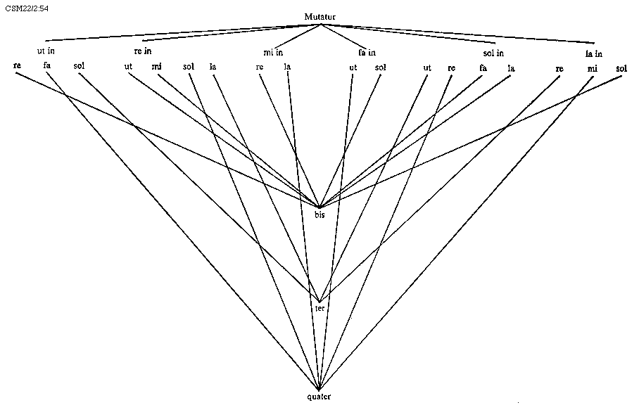 [54][CSM22/2:54; text: Mutatur, ut in re, fa, sol; re in ut, mi, sol, la; mi in re, la; fa in ut, sol; sol in ut, re, fa, la; la in re, mi, sol; bis, ter, quater]