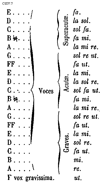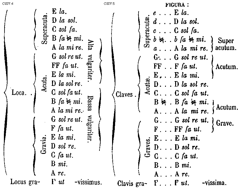 [CSIV:5; text: Figura: Claves. Superacutae. e...E la. d... D la sol. c...C sol fa. b [sqb]...b fa [sqb] mi. a...A la mi re. Super acutum. Acutae. G...G sol re ut. FF...F fa ut. E...E la mi. Acutum. D...D la sol re. C...C sol fa ut. B [sqb]...B fa [sqb] mi. A...A la mi re. Acutum. Graves. G...G sol re ut. F...FF fa ut. Grave. E...E la mi. D...D sol re. C...C fa ut. B...B mi. A...A re. Clavis gravissima. [Gamma]...[Gamma] ut.]