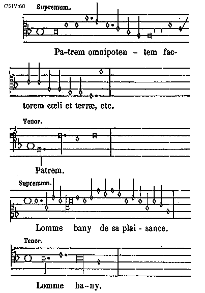 [CSIV: 60; text: Supremum. Patrem omnipotentem factorem coeli et terrae, etc. Tenor. Patrem. Lomme bany de sa plaisance. Lomme bany.]