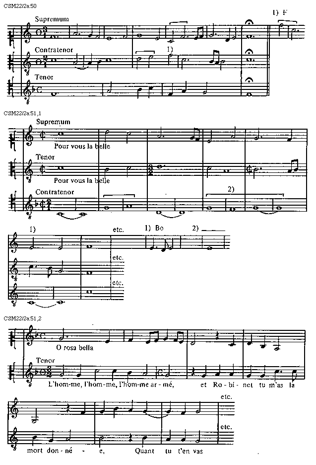 [51][CSM22/2a:51,1; text: Supremum, Tenor, Contratenor, Pour vous la belle, etc.]