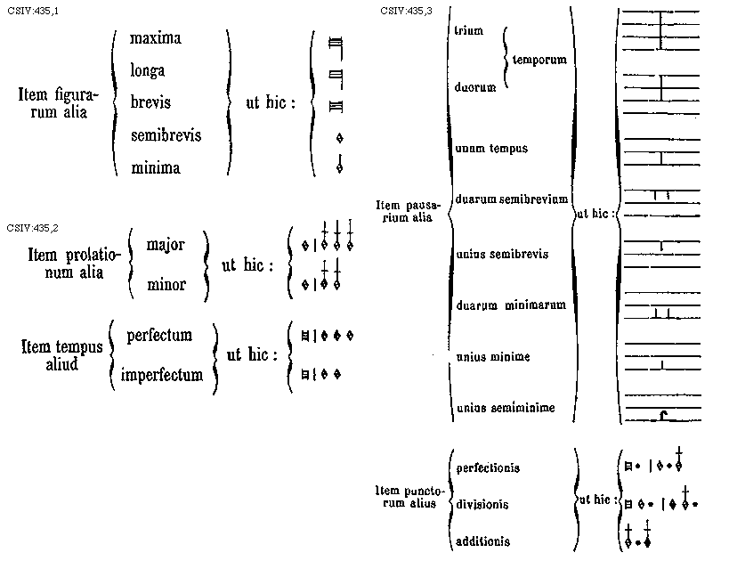 [CSIV:435,3; text: Item pausarium alia, trium, duorum, temporum, unum tempus, duarum semibrevium, unius semibrevis, duarum minimarum, unius minime, unius semiminime, ut hic, Item punctorum alius, perfectionis, divisionis, additionis, ut hic]