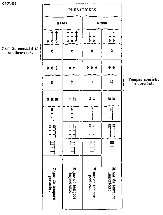 [CSIV:436; text: Prolationes, Major, Minor, Prolatio consistit in semibrevibus. Tempus consistit in brevibus. Major de tempore perfecto. Major de tempore imperfecto. Minor de tempore perfecto. Minor de tempore imperfecto.]
