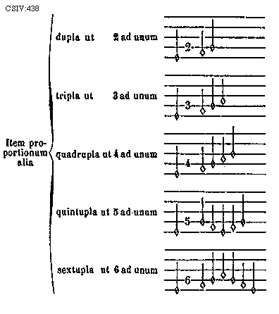 [CSIV:438; text: Item proportionum alia dupla ut 2 ad unum, tripla ut 3 ad unum, quadrupla ut 4 ad unum, quintupla ut 5 ad unum, sextupla ut 6 ad unum]