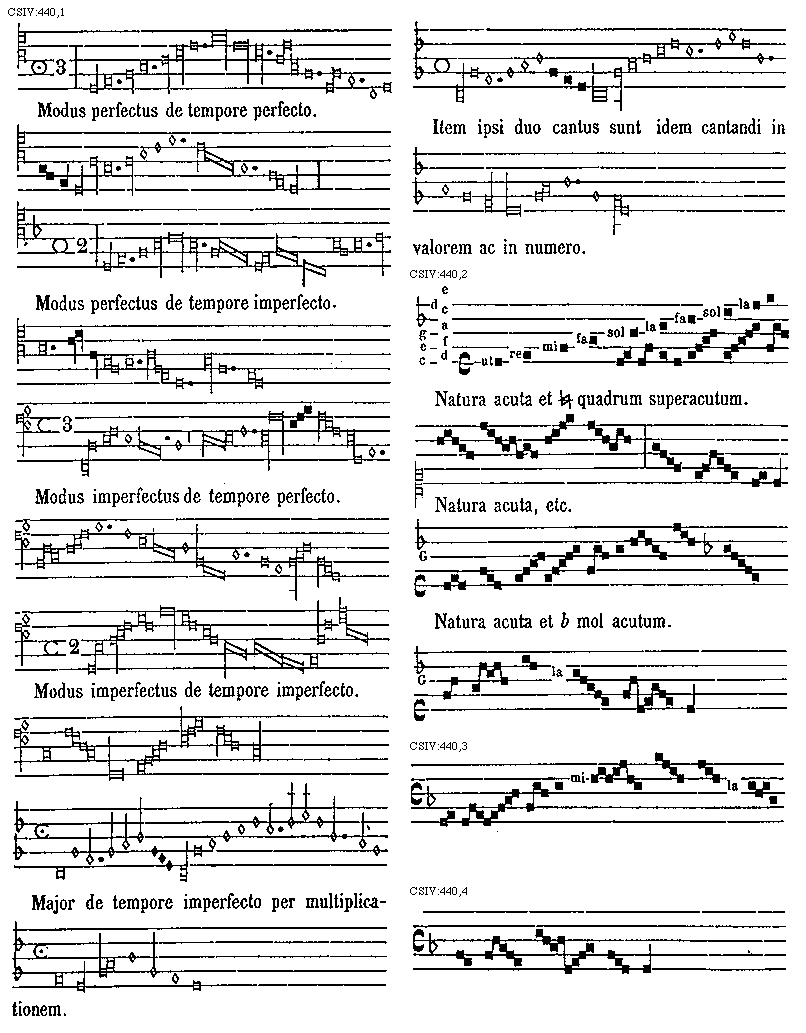 [439][CSIV:439; text: Item modorum alius, perfectus, de tempore perfecto, de tempore imperfecto, prolationis, majoris, minoris, imperfectus, Item signorum aliud, modi perfecti temporis perfecti, modi perfecti temporis imperfecti, modi imperfecti temporis perfecti, modi imperfecti temporis imperfecti, Modus, Perfectus, major, minor, Imperfectus, Prolatio major. Prolatio minor. Prolatio consistit in semibrevibus. Tempus consistit in brevibus. Modus consistit in maximis et in longis. Modus perfectus de tempore perfecto majoris aut minoris prolationis. Modus perfectus de tempore imperfecto majoris aut minoris prolationis. Modus imperfectus de tempore perfecto majoris aut minoris prolationis. Modus imperfectus de tempore imperfecto majoris vel minoris prolationis.]
