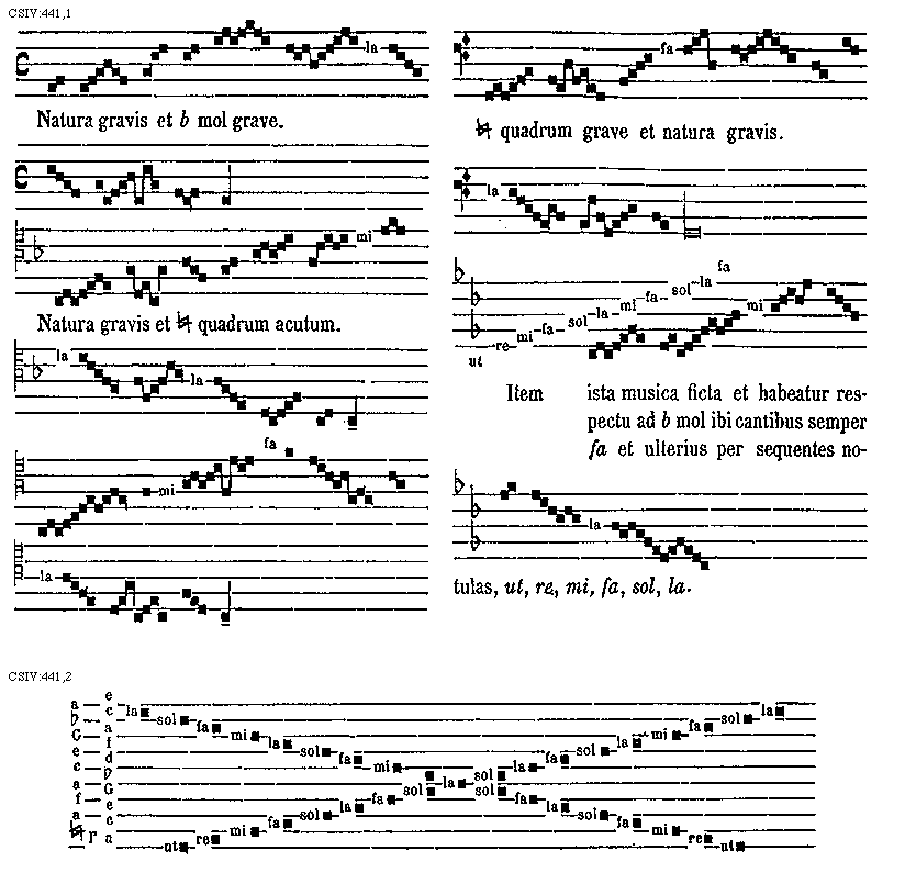 [441][CSIV:441,1; text: ut, re, mi, fa, sol, la. Natura gravis et b mol grave. Natura gravis et [sqb] quadrum acutum. [sqb] quadrum grave et natura gravis. Item ista musica ficta et habeatur respectu ad b mol ibi cantibus semper fa et ulterius per sequentes notulas, ut, re, mi, fa, sol, la]