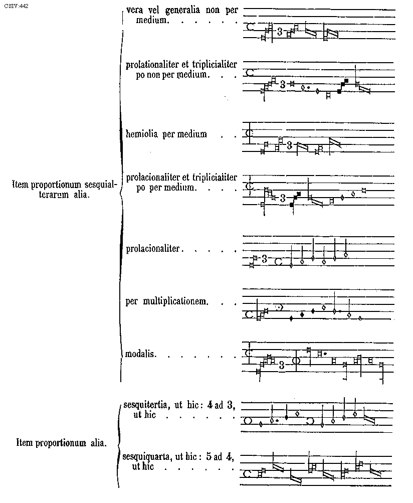 [442][CSIV:442; text: Item proportionum sesquialterarum alia. vera vel generalia non per medium, prolationaliter et triplicialiter po non per medium, hemiolia per medium, prolacionaliter et triplicialiter po per medium, prolacionaliter, per multiplicationem, modalis, Item proportionum alia. sesquitertia, ut hic: 4 ad 3, sesquiquarta, ut hic: 5 ad 4]