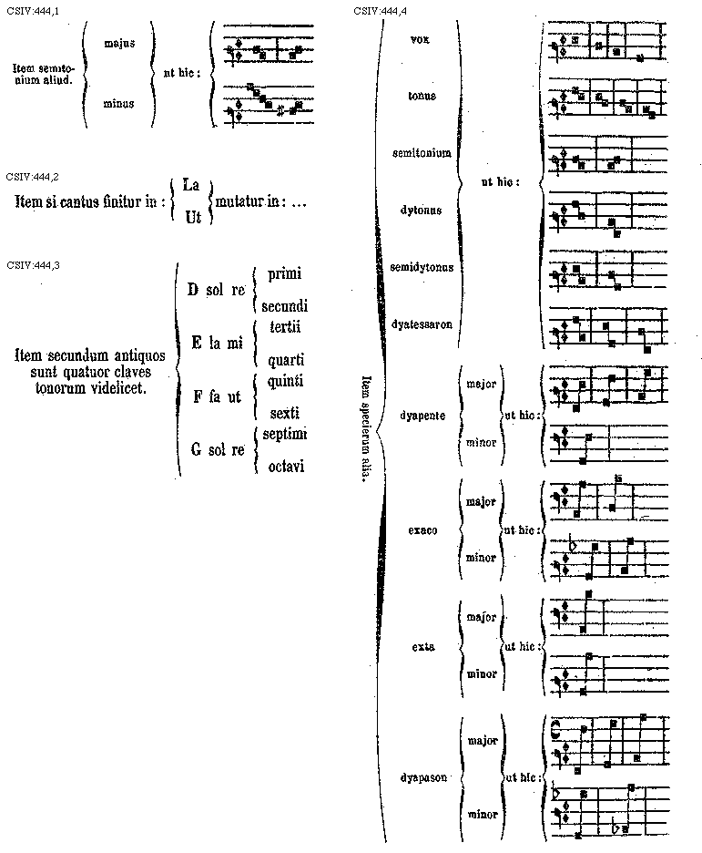 [CSIV:444,4; text: Item specierum alia. vox, tonus, semitonium, dytonus, semidytonus, dyatessaron, ut hic: dyapente, major, minor, exaco, exta, dyapason]