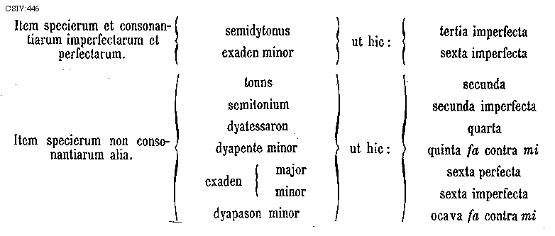 [446][CSIV:446; text: Item specierum et consonantiarum imperfectarum et perfectarum. semidytonus, exaden minor, ut hic: tertia imperfecta, sexta imperfecta, Item specierum non consonantiarum alia. tonns, semitonium, dyatessaron, dyapente minor, exaden, major, minor, dyapason minor, secunda, secunda imperfecta, quarta, quinta fa contra mi, sexta perfecta, sexta imperfecta, ocava fa contra mi]