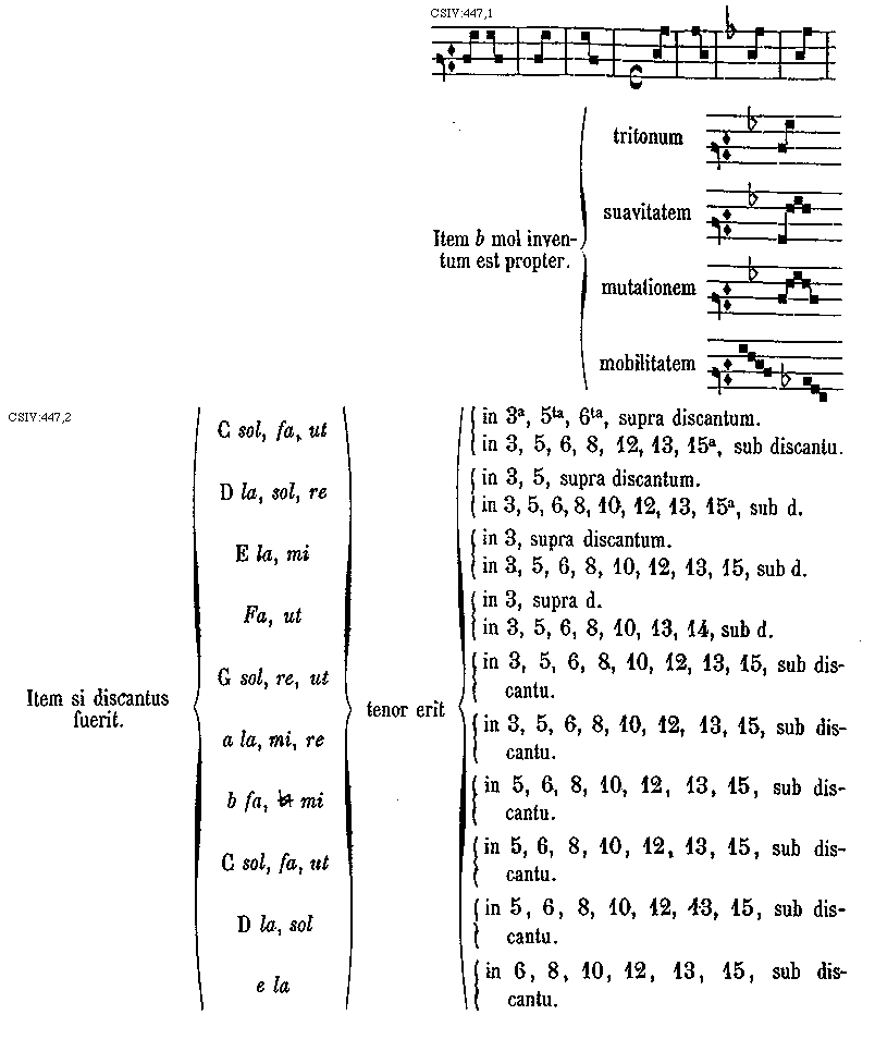 [448][CSIV:448; text: Item si discantus fuerit in unisono supra tenorem tunc. contratenor erit in: 1a, 3a, 5a, 6a, 8a, 10a, 12a, sub tenore, triplum, 5a, 3a, supra tenorem. 3a, 5a, 6a, 8a, 10a, sub tenore. 5, 3, supra contratenore. 3, 6, 8, sub contratenore. 8, 5, 3, supra contratenore. 6, 8, sub contratenore. 10, 8, 3, supra contratenore. 3, 5, sub contratenore. 12, 10, 8, 6, 5, supra contratenore. 3, sub contratenore. 10, 8, ,6, ,5, ,3, supra contratenore. 15, 12, 10, 8, 6, 5, 3, supra contratenorem. Item si discantus fuerit in 3a supra tenorem tunc. 10, 8, supra contratenorem. 6, 8, sub contratratenore. 10, 3, supra contratenorem. 3, 5, sub contratenore. 10, 6, 5, 3, supra contratenorem. 3, sub contratenore. 15, 8, 5, 3, supra contratenorem. Item si discantus fuerit in quinta supra tenorem, tunc. 8a, 10a, sub contratenore. 8a, 3a, supra contratenorem. 3a, sub contratenore. 10a, 5a, 3a, supra contratenorem.]