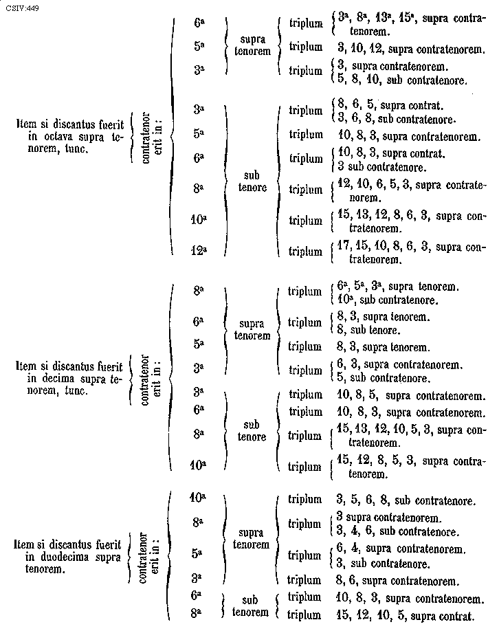 [449][CSIV:449; text: Item si discantus fuerit in octava supra tenorem, tunc. contratenor erit in: 6a, 5a, 3a, supra tenorem, triplum, 3a, 8a, 13a, 15a, supra contratenorem. 3, 10, 12, supra contratenorem. 3, supra contratenorem. 5, 8, 10, sub contratenore. 8a, 10a, 12a, sub tenore, 8, 6, 5, supra contratenorem. 3, 6, 8, sub contratenore. 10, 8, 3, supra contratenorem. 10, 8, 3, supra contratenorem. 3 sub contratenore. 12, 10, 6, 5, 3, supra contratenorem. 15, 13, 12, 8, 6, 3, supra contratenorem. 17, 15, 10, 8, 6, 3, supra contratenorem. Item si discantus fuerit in decima supra tenorem, tunc. 6a, 5a, 3a, supra tenorem. 10a, sub contratenore. 8, 3, supra tenorem. 8, sub tenore. 6, 3, supra contratenorem. 5, sub contratenore. 10, 8, 5, supra contratenorem. 10, 8, 3, supra contratenorem. 15, 13, 12, 10, 5, 3, supra contratenorem. 15, 12, 8, 5, 3, supra contratenorem. Item si discantus fuerit in duodecima supra tenorem. 3, 5, 6, 8, sub contratenore. 3, 4, 6, sub contratenore. 6, 4, supra contratenorem. 8, 6, supra contratenorem. 15, 12, 10, 5, supra contratenorem.]