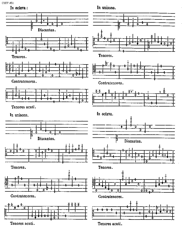 [451][CSIV:451; text: In octava: Discantus. Tenores. Contratenores. Tenores acuti. In unisono.]