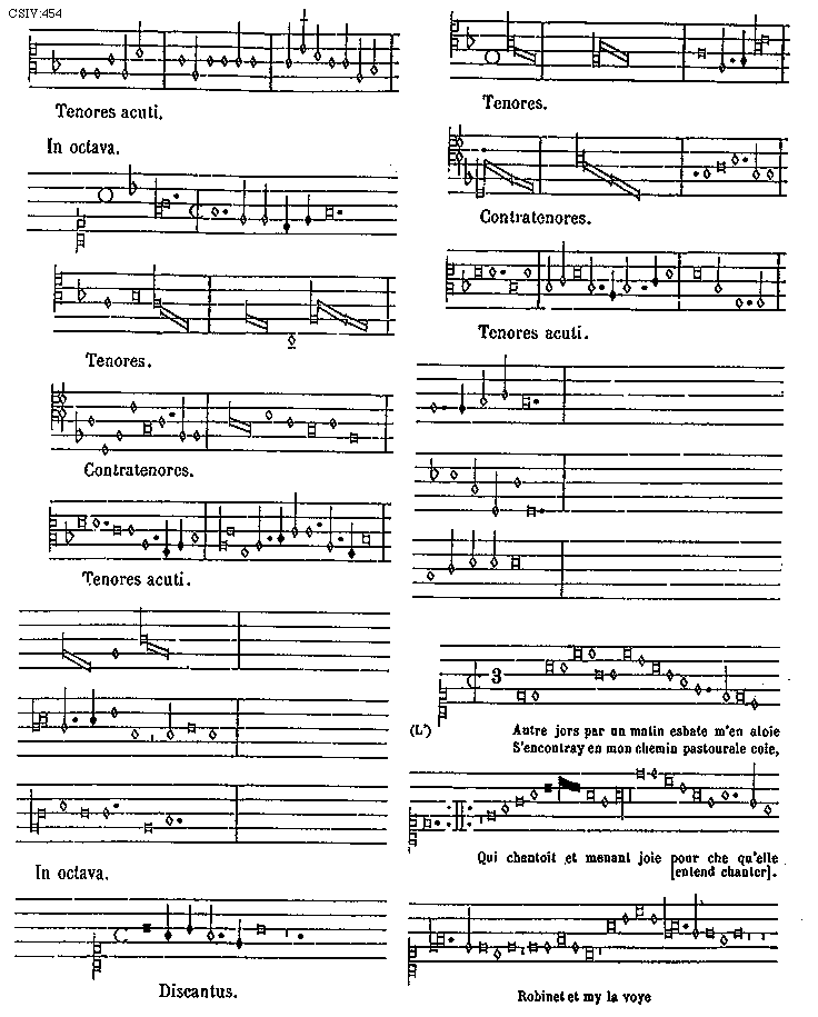 [454][CSIV:454; text: Tenores acuti. In octava. Tenores. Contratenores. Discantus. (L') Autre jors par un matin esbate m'en aloie, S'encontray en mon chemin pastourele coie,