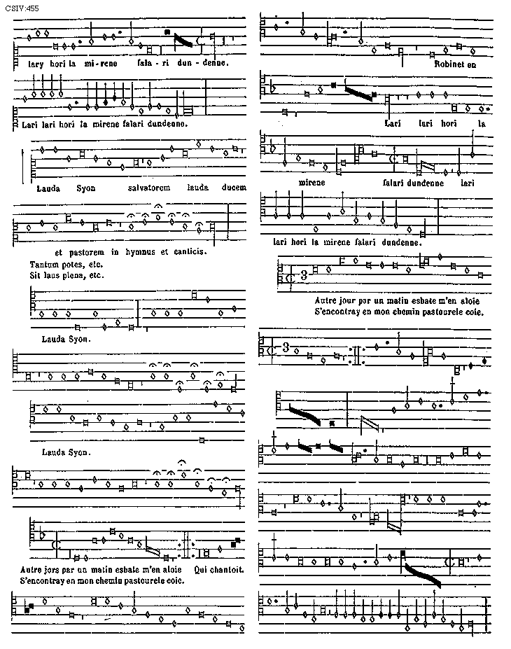 [455][CSIV:455; text: lary hori la mirene falari dundenne. Lari lari hori la mirene falari dundenne. Lauda Syon salvatorem lauda ducem et pastorem in hymnus et canticis. Tantum potes, etc. Sit laus plena, etc. Autre jors par un matin esbate m'en aloie S'encontray en mon chemin pastourele coie. Qui chantoit. Robinet en Lari lari hori la mirene falari dundenne. Autre jour par un matin esbate m'en aloie]