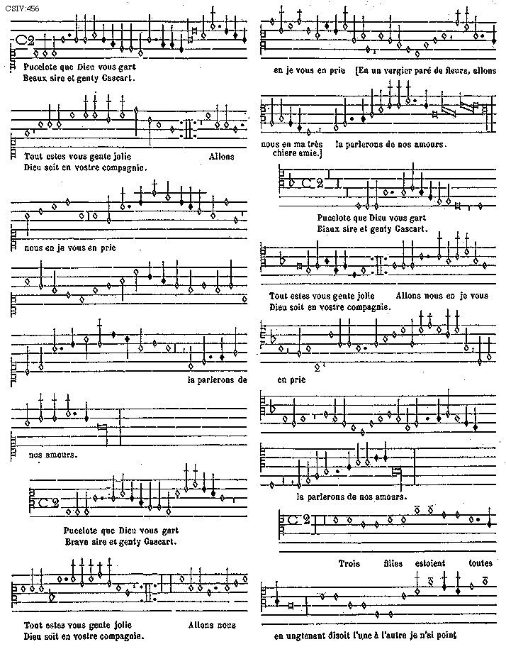 [456][CSIV:456; text: Pucelote que Dieu vous gart Beaux sire et genty Gascart. Tout estes vous gente jolie Dieu soit en vostre compagnie. Allons nous en je vous en prie la parlerons de nos amours. Brave sire et genty Gascart. Allons nous en je vou en prie [En un vergier paré de fleurs, allons nous en ma très chiere amie.] Biaux sire et genty Gascart. Trois filles estoient toutes en ungtenant disoit l'une a l'autre je n'ai point]