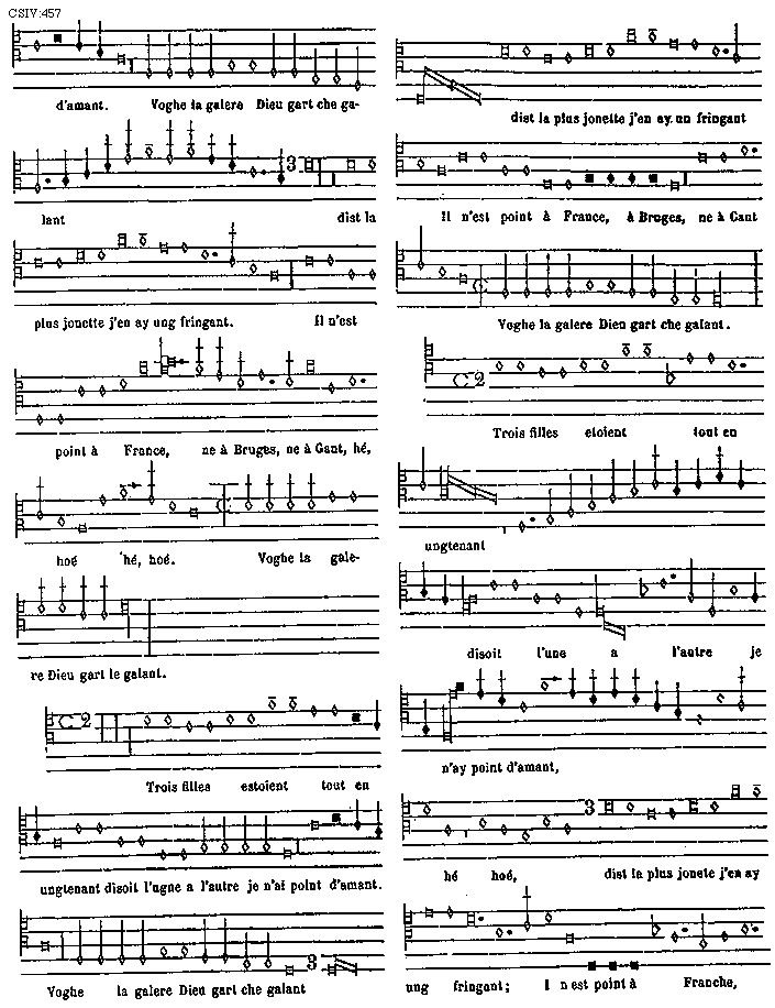 [457][CSIV:457; text: d'amant. Voghe la galere Dieu gart che galant dist la plus jonette j'en ay ung fringant Il n'est point à France, ne à Bruges, ne à Gant, hé, hoé hé, hoé. Voghe la galere Dieu gart le galant. Trois filles etoient tout en ungtenant disoit l'ugne a l'autre je n'ai point d'amant. Il n'est point à France, à Bruges, ne à Gant hé hoé dist la plus jonete j'en ay ung fringant; I nest point a Franche]