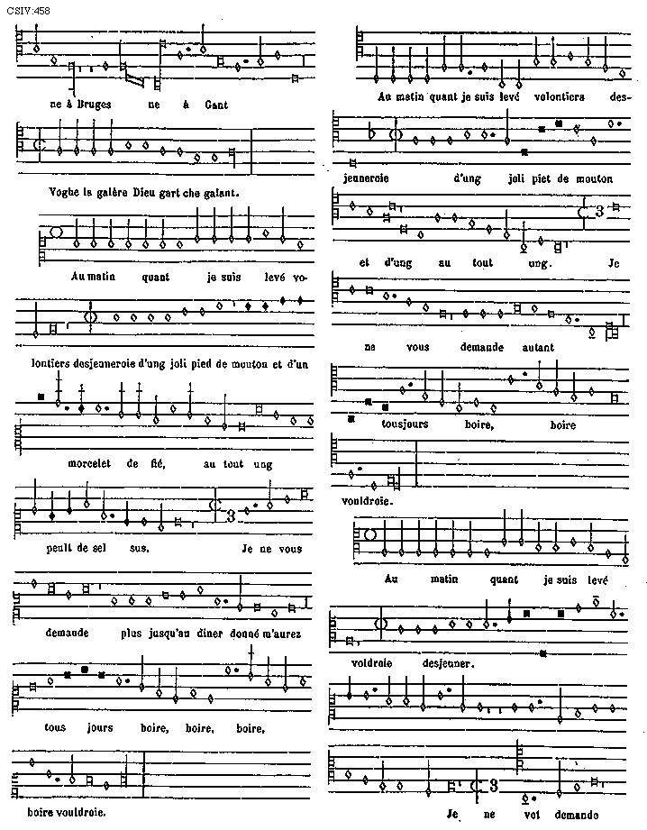 [458][CSIV:458; text: ne à Bruges ne à Gant Voghe la galère dieu gart che galant. Au matin quant je suis levé volontiers desjeuneroie d'ung joli pied de mouton et d'un morcelet de fié, au tout ung peult de sel sus. Je ne vous demande plus jusqu'au diner donné m'aurez tous jours boire, boire, boire, boire vouldroie. Au matin quant je suis levé volontiers desjeuneroie d'ung joli piet de mouton et d'ung au tout ung. Je ne vous demande autant tousjours boire, boire vouldroie. Au matin quant je suis levé voldroie desjeuner. Je ne vot demande]