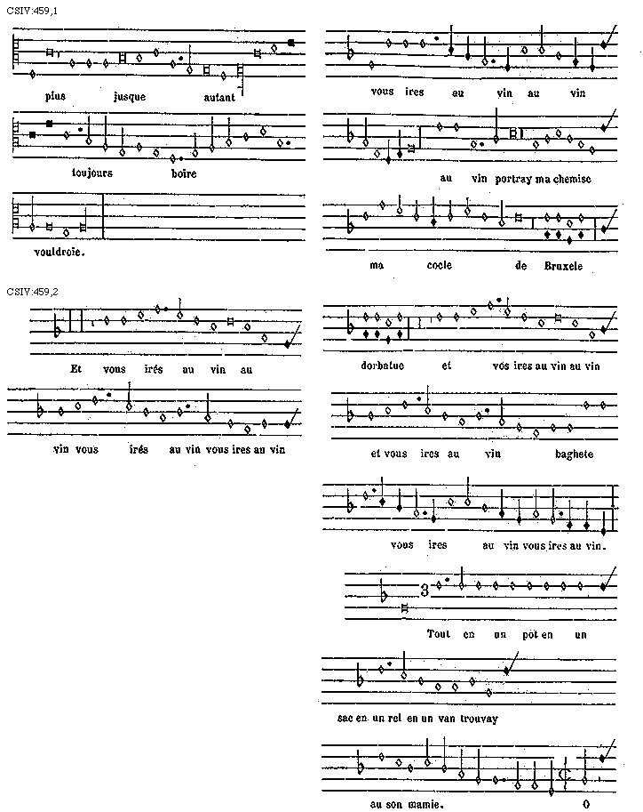 [CSIV:459,2; text: Et vous ires au vin au vin vous ires au vin vous ires au vin vous ires au vin au vin au vin portray ma chemise ma cocle de Bruxele dorbatue et vos ires au vin au vin et vous ires au vin baghete vous ires au vin vous ires au vin. Tout en un pot en un sac en un rel en un van trouvay au son mamie. O]