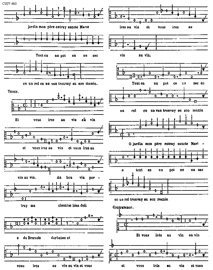 [460][CSIV:460; text: jardin mon père entray sancte Marie Tout en un pot en un sac en un rel en un van trouvay au son mamie. Tenor. Et vous ires au vin au vin et vous ires au vin et vous ires au vin au vin. Au bon vin portray ma chemise bien deli e de Bruxele dorbatue et vous ires au vin au vin et vous ires au vin et vous ires au vin au vin. Tout en un pot en un sac en un rel en un van trouvay au son mamie O jardin mon père entray sancte Marie tout en un pot en un sac en un rel trouvay au son mamie. Contratenor.]