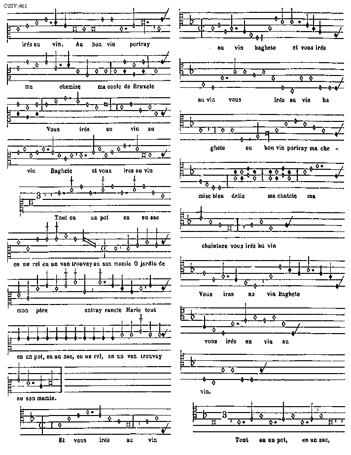 [461][CSIV:461; text: ires au vin. Au bon vin portray ma chemise ma cocle de Bruxele Vous ires au vin au vin Baghete et vous ires au vin Tout en un pot en un sac en un rel en un van trouvay au son mamie O jardin de mon père entray sancte Marie tout en un pot, en un sac, en un rel, en un van trouvay au son mamie. Et vous ires au vin au vin baghete et vous ires au vin vous ires au vin baghete au bon vin portray ma chemise bien delie ma chotcle ma chainture vous ires au vin Vous ires au vin Baghete vous ires au vin au vin. Tout en pot, en un sac]