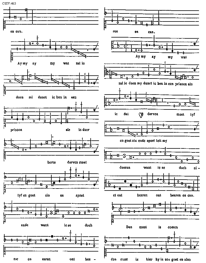 [463][CSIV:463; text: en can. Ay my ay my wat zal ic doen mi dunct ic ben in een prisoen als ic daer herte derven moet lyf en goet zin en spoet ende want ic se doch nie on eeren ont beeren en can. Ay my ay my wat zal ic doen my dunct ic ben in een prisoen als ic dat [herte] derven moet lyf en goet zin ende spoet leit my doeran want ic se doch niet ont beeren ont beeren en can. Den most is comen den most is hier hy soo goet en also]