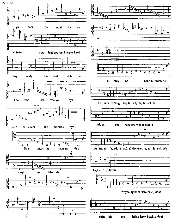 [464][CSIV:464; text: fyn daer om moet hy ge drinken syn laet sparen knoyte knol hop ende bier laet drinken win laet vrolyc syn alle willekom soe moellen syn, etc. Si eloy de haer buixken dede haer weezy, re, fa, sol, la, la, sol fa, mi, re, soe wee soe wee meynstu waren, sol, fa, mi, re, sol, si daerme, la, sol, la, ach ach hay si drulderme. Weyde fy noch wre ost ij haer sotte kie zou helas haer buxkin doet]