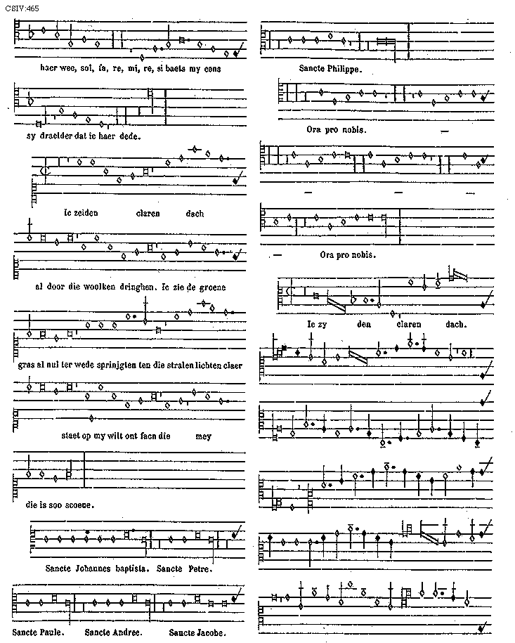 [465][CSIV:465; text: haer wee, sol, fa, re, mi, re, si baets my eens sy draelder dat ic haer dede. Ic zeiden claren dach al door die woolken dringhen. Ic zie de groene gras al nul ter wede sprinjgten ten die stralen lichten claer staet op my wilt ont facn die mey die is soo scoene. Sancte Johannes baptista. Sancte Petre. Sancte Paule. Sancte Andree. Sancte Jacobe. Sancte Philippe. Ora pro nobis. Ic zy den claren dach.]