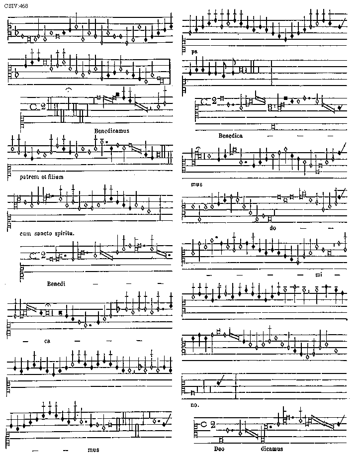 [468][CSIV:468; text: Benedicamus patrem et filium cum sancto spiritu. Benedicamus pa. Benedicamus domino. Deo dicamus]
