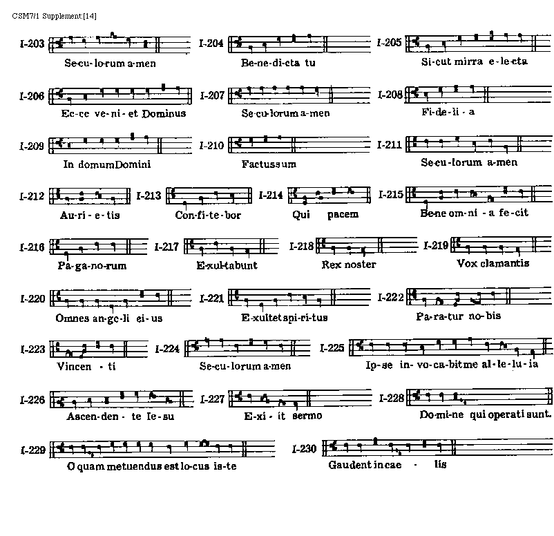 [CSM7/1 Supplement:[14]; text: Seculorum amen, Benedicta tu, Sicut mirra electa, Ecce veniet Dominus, Fidelia, In domum Domini, Factus sum, Aurietis, Confitebor, Qui pacem, Bene omnia fecit, Paganorum, Exultabunt, Rex noster, Vox clamantis, Omnes angeli eius, Exultet spiritus, Paratur nobis, Vincenti, Ipse in vocabit me alleluia, Ascendente Iesu, Exiit sermo, Domine qui operati sunt. O quam metuendus est locus iste, Gaudent in caelis, I-203, I-204, I-205, I-206, I-207, I-208, I-209, I-210, I-211, I-212, I-213, I-214, I-215, I-216, I-217, I-218, I-219, I-220, I-221, I-222, I-223, I-224, I-225, I-226, I-227, I-228, I-229, I-230]