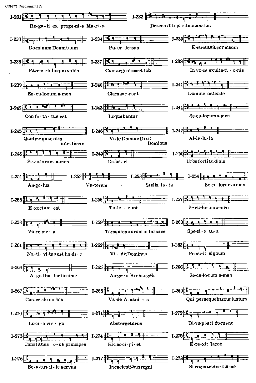 [CSM7/1 Supplement:[15]; text: Regali ex progenie Maria, Descendit spiritus sanctus, Dominum Deum tuum, Puer Iesus, Eructavit cor meum, Pacem relinquo vobis, Cum aegro tasset Iob, In voce exultationis, Seculorum amen, Clamaverunt, Domine ostende, Confortatus est, Loquebantur, Quid me quaeritis interficere, Vide Domine Dixit Dominus, Alleluia, Gabriel, Urbs fortitudinis, Angelus, Veterem, Stella ista, Exortum est, Tulerunt, Voce mea, Tamquam aurum in fornace, Specie tua, Nativitas est hodie, Vidit Dominus, Posuit signum, Agatha laetissime, Angeli Archangeli, Concede nobis, Vade Anania, Qui persequebantur iustum, Lucia virgo, Absterget deus, Dirupisti domine, Constitues eos principes, Hic accipiet, Erexit Iacob, Beatus ille servus, In caelestibus regni, Si cognovissetis me, I-231, I-232, I-233, I-234, I-235, I-236, I-237, I-238, I-239, I-240, I-241, I-242, I-243, I-244, I-245, I-246, I-247, I-248, I-249, I-250, I-251, I-252, I-253, I-254, I-255, I-256, I-257, I-258, I-259, I-260, I-261, I-262, I-263, I-264, I-265, I-266, I-267, I-268, I-269, I-270, I-271, I-272, I-273, I-274, I-275, I-276, I-277, I-278]