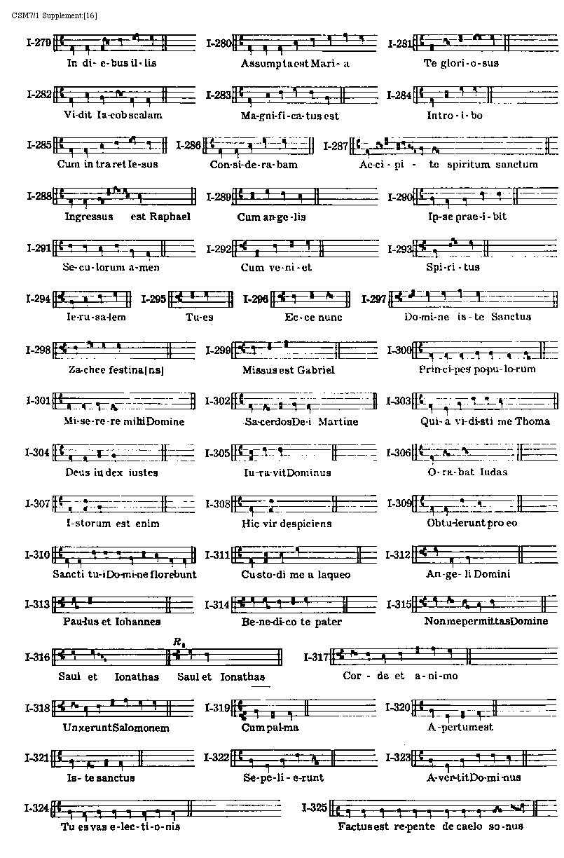 [CSM7/1 Supplement:[16]; text: In diebus illis, Assumpta est Maria, Te gloriosus, Vidit Iacob scalam, Magnificatus est, Introibo, Cum intraret Iesus, Considerabam, Accipite spiritum sanctum, Ingressus est Raphael, Cum angelis, Ipse praeibit, Seculorum amen, Cum veniet, Spiritus, Ierusalem, Tues, Ecce nunc, Domine iste Sanctus, Zachee festina[ns], Missus est Gabriel, Principes populorum, Miserere mihi Domine, Sacerdos Dei Martine, Quia vidisti me Thoma, Deus iudex iustes, Iuravit Dominus, Orabat Iudas, Istorum est enim, Hic vir despiciens, Obtulerunt pro eo, Sancti tui Domine florebunt, Custodi me a laqueo, Angeli Domini, Paulus et Iohannes, Benedico te pater, Non me permittas Domine, Saul et Ionathas, Corde et animo, Unxerunt Salomonem, Cum palma, Apertum est, Iste sanctus, Sepelierunt, Avertit Dominus, Tu es vas electionis, Factus est repente de caelo sonus, I-279, I-280, I-281, I-282, I-283, I-284, I-285, I-286, I-287, I-288, I-289, I-290, I-291, I-292, I-293, I-294, I-295, I-296, I-297, I-298, I-299, I-300, I-301, I-302, I-303, I-304, I-305, I-306, I-307, I-308, I-309, I-310, I-311, I-312, I-313, I-314, I-315, I-316, I-317, I-318, I-319, I-320, I-321, I-322, I-323, I-324, I-325]