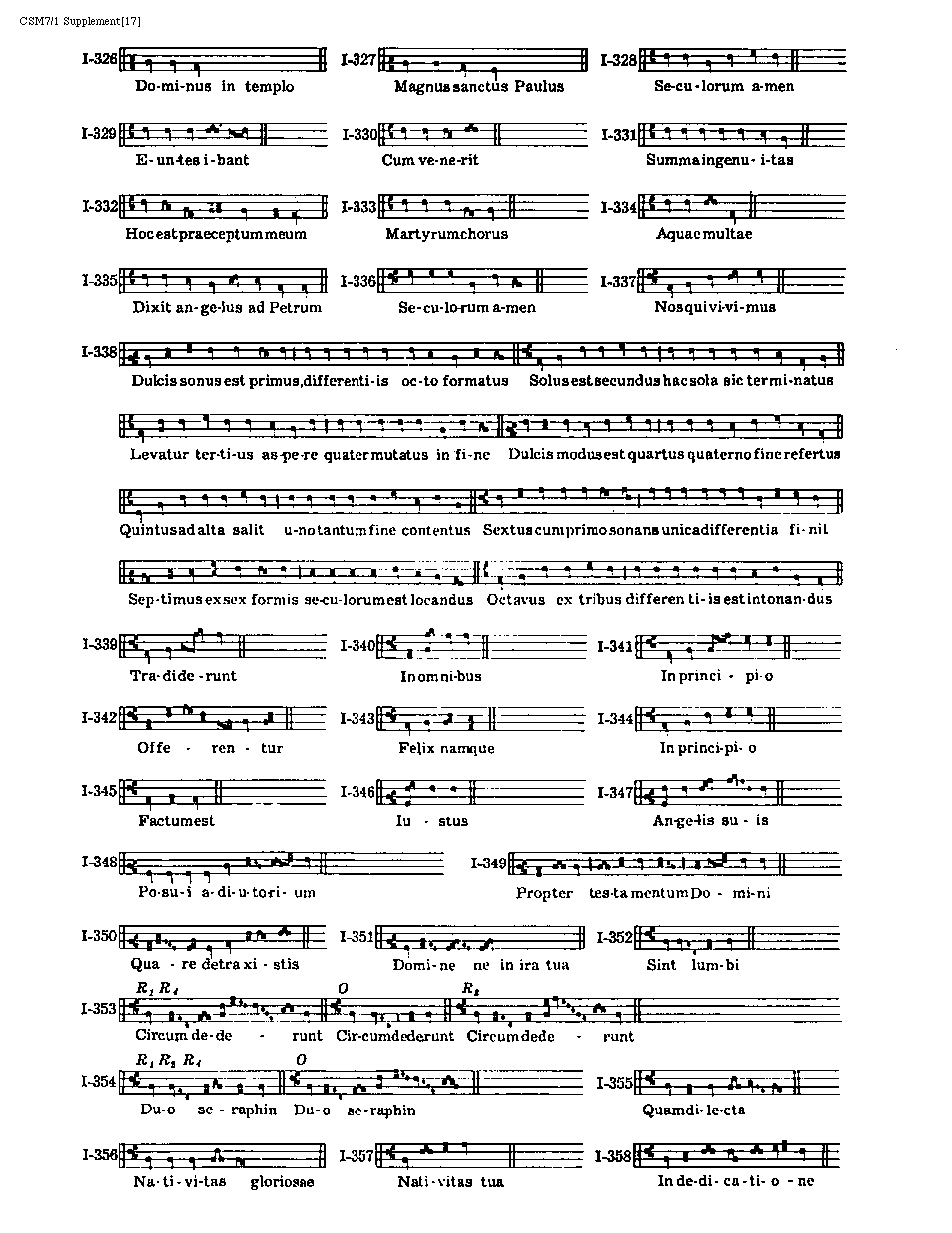 [CSM7/1 Supplement:[17]; text: Dominus in templo, Magnus sanctus Paulus, Seculorum amen, Euntes ibant, Cum venerit, Summa ingenuitas, Hoc est praeceptum meum, Martyrum chorus, Aquae multae, Dixit angelus ad Petrum, Nos qui vivimus, Dulcis sonus est primus, differentiis octo formatus, Solus est secundus hac sola sic terminatus, Levatur tertius aspere quater mutatus in fine, Dulcis modus est quartus quaterno fine refertus, Quintus ad alta salit uno tantum fine contentus, Sextus cum primo sonans unica differentia finit, Septimus ex sex formis seculorum est locandus, Octavus ex tribus differentiis est intonandus, Tradiderunt, In omnibus, In principio, Offerentur, Felix namque, Factum est, Iustus, Angelis suis, Posui adiutorium, Propter testamentum Domini, Quare detraxistis, Domine ne in ira tua, Sint lumbi, Circumdederunt, Duo seraphin, Quam dilecta, Nativitas gloriosae, Nativitas tua, In dedicatione, I-326, I-327, I-328, I-329, I-330, I-331, I-332, I-333, I-334, I-335, I-336, I-337, I-338, I-339, I-340, I-341, I-342, I-343, I-344, I-345, I-346, I-347, I-348, I-349, I-350, I-351, I-352, I-353, I-354, I-355, I-356, I-357, I-358]