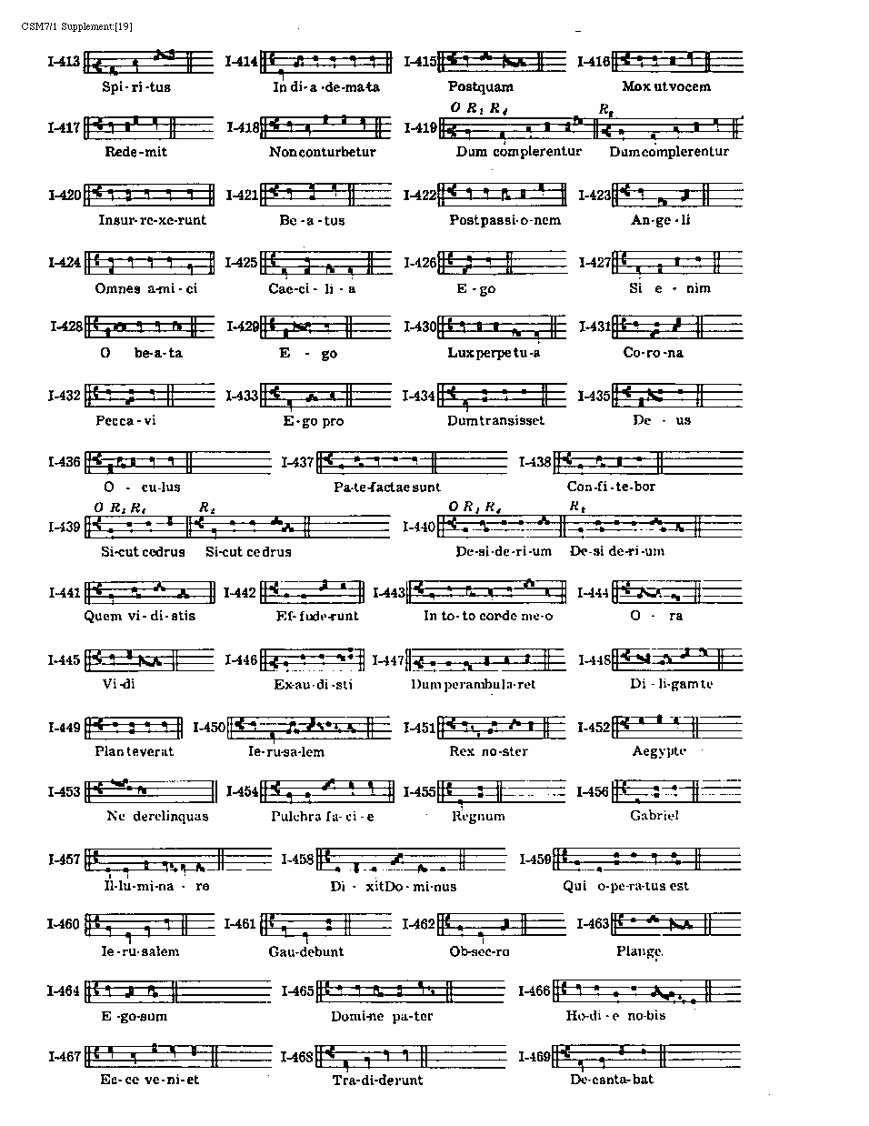 [CSM7/1 Supplement:[19]; text: Spiritus, In diademata, Postquam, Mox ut vocem, Redemit, Non conturbetur, Dum complerentur, Insurrexerunt, Beatus, Post passionem, Angeli, Omnes amici, Caecilia, Ego, Si enim, O beata, Lux perpetua, Corona, Peccavi, Ego pro, Dum transisset, Deus, Oculus, Patefactae sunt, Confitebor, Sicut cedrus, Desiderium, Quem vidistis, Effuderunt, In toto corde meo, Ora, Vidi, Exaudisti, Dum perambularet, Diligam te, Planteverat, Ierusalem, Rex noster, Aegypte, Ne derelinquas, Pulchra facie, Regnum, Gabriel, Illuminare, Dixit Dominus, Qui operatus est, Gaudebunt, Obsecro, Plange, Ego sum, Domine pater, Hodie nobis, Ecce veniet, Tradiderunt, Decantabat, I-413, I-414, I-415, I-416, I-417, I-418, I-419, I-420, I-421, I-422, I-423, I-424, I-425, I-426, I-427, I-428, I-429, I-430, I-431, I-432, I-433, I-434, I-435, I-436, I-437, I-438, I-439, I-440, I-441, I-442, I-443, I-444, I-445, I-446, I-447, I-448, I-449, I-450, I-451, I-452, I-453, I-454, I-455, I-456, I-457, I-458, I-459, I-460, I-461, I-462, I-463, I-464, I-465, I-466, I-467, I-468, I-469]