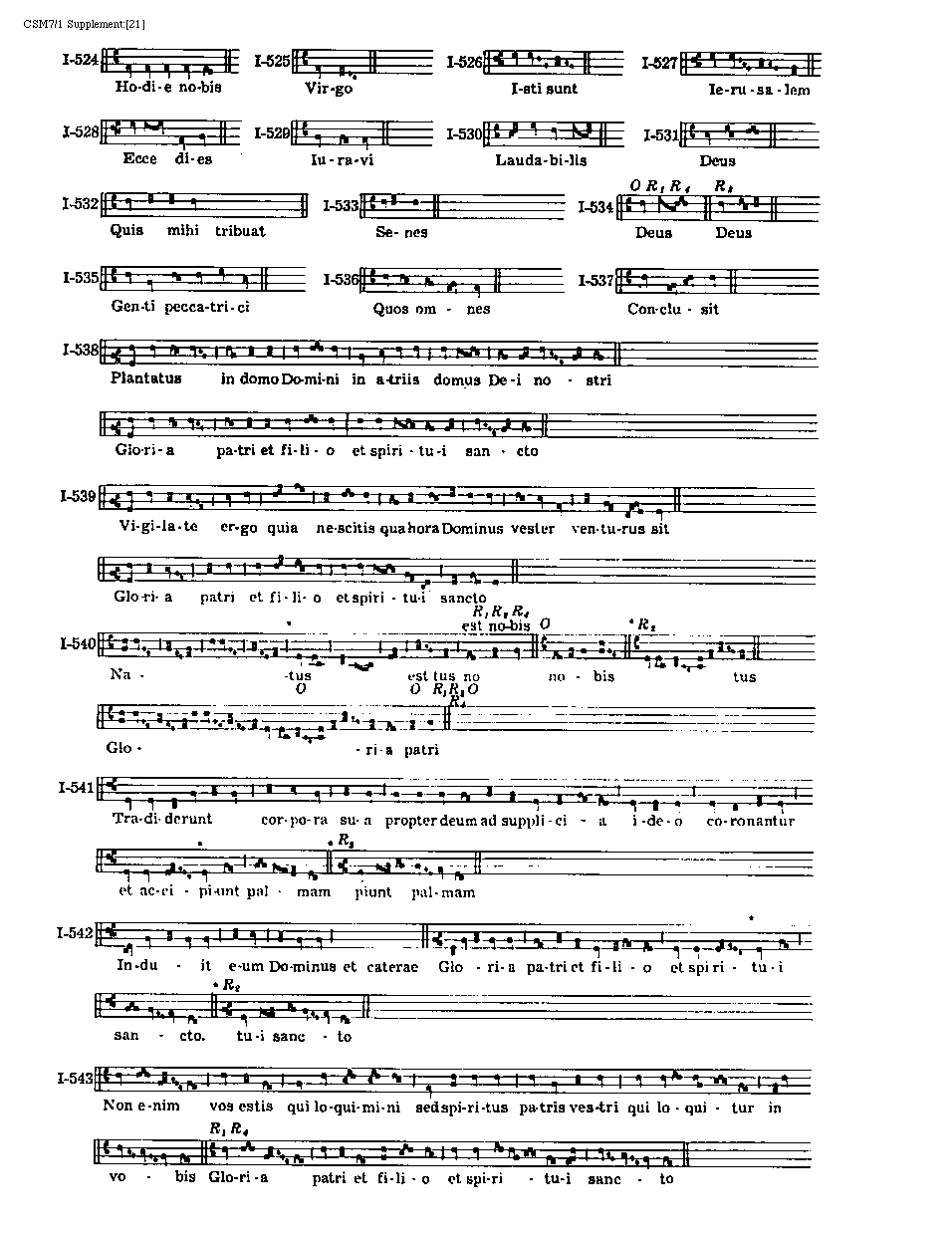 [CSM7/1 Supplement:[21]; text: Hodie nobis, Virgo, Isti sunt, Ierusalem, Ecce dies, Iuravi, Laudabilis, Deus, Quis mihi tribuat, Senes, Genti peccatrici, Quos omnes, Conclusit, Plantatus in domo Domini in atriis domus Dei nostri, Gloria patri et filio et spiritui sancto, Vigilate ergo quia nescitis qua hora Dominus vester venturus sit, Natus est nobis, Tradiderunt corpora sua propter deum ad supplicia ideo coronantur et accipiunt palmam, Induit eum Dominus et caterae, Non enim vos estis qui loquimini sed spiritus patris vestri qui loquitur in vobis, I-524, I-525, I-526, I-527, I-528, I-529, I-530, I-531, I-532, I-533, I-534, I-535, I-536, I-537, I-538, I-539, I-540, I-541, I-542, I-543]