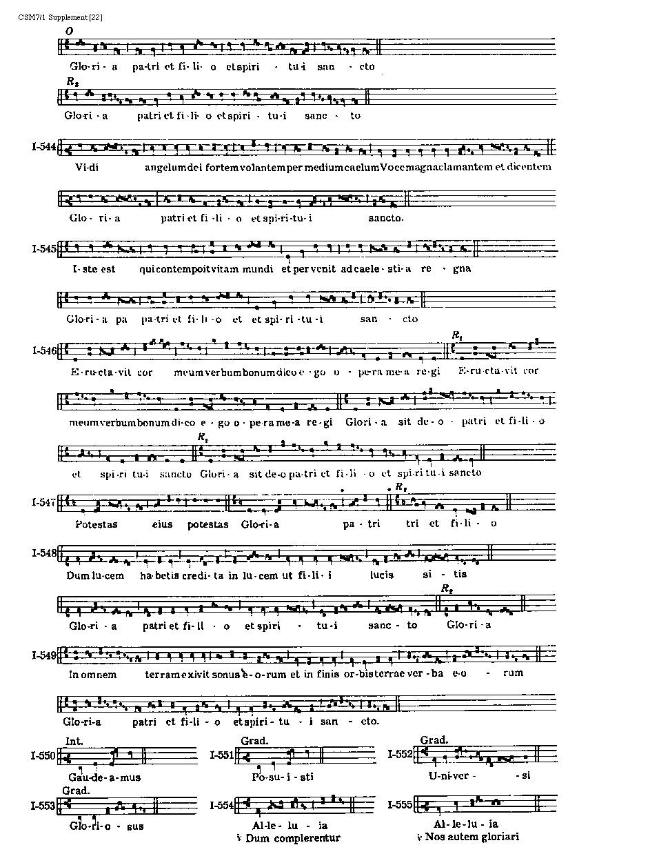 [CSM7/1 Supplement:[22]; text: Gloria patri et filio et spiritui sancto. Vidi angelum dei fortem volantem per medium caelum, Voce magna clamantem et dicentem, Iste est qui contempoit vitam mundi et pervenit ad caelestia regna, Eructavit cor meum verbum bonum dico ego opera mea regi, Gloria sit deo patri et filio et spiritui sancto, Potestas eius potestas, Dum lucem habetis credita in lucem ut filii lucis sitis, In omnem terram exivit sonus eorum et in finis orbis terrae verba eorum, Gaudeamus, Posuisti, Universi, Gloriosus, Alleluia Versus Dum complerentur, Alleluia Versus Nos autem gloriari, I-544, I-545, I-546, I-547, I-548, I-549, I-550, I-551, I-552, I-553, I-554, I-555]