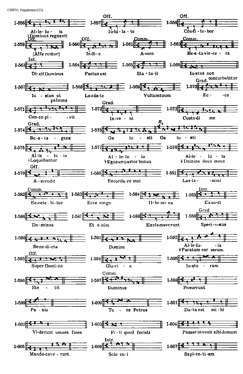 [CSM7/1 Supplement:[23]; text: Alleluia Versus Dominus regnavit, Offertorium, Iubilate, Confitebor, [Afferentur], In die, Communio, Amen, Beata viscera, Introitus, Dicit Dominus, Factus est, Statuit, Iustus non conturbabitur, Iustus ut palmma, Laudate, Vultum tuum, Graduale, Ecce, Concupivit, Inveni, Custodi me, Beata gens, Os iusti, Alleluia Versus Loquebantur, Alleluia Versus Ego sum pastor bonus, Alleluia Versus Domine deus meus, Ascendit, Recordare mei, Laetamini, Revelabitur, Ecce virgo, Illumina, Exaudi, Dominus, Et enim, Exclamaverunt, Speciosus, Benedicta, Domine, Alleluia Versus Paratum cor meum, Super flumina, Gloria, Iustorum, Stetit, Posuerunt, Panis, Tu es Petrus, Data est mihi, Viderunt omnes fines, Fili quod fecisti, Passer invenit sibi domum, Manducaverunt, Scio cui, Sapientiam, I-556, I-557, I-558, I-559, I-560, I-561, I-562, I-563, I-564, I-565, I-566, I-567, I-568, I-569, I-570, I-571, I-572, I-573, I-574, I-575, I-576, I-577, I-578, I-579, I-580, I-581, I-582, I-583, I-584, I-585, I-586, I-587, I-588, I-589, I-590, I-591, I-592, I-593, I-594, I-595, I-596, I-597, I-598, I-599, I-600, I-601, I-602, I-603, I-604, I-605, I-606, I-607]