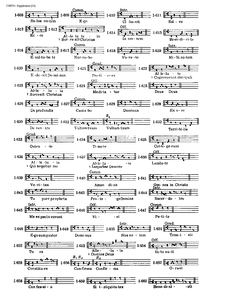 [CSM7/1 Supplement:[24]; text: Salus autem, Communio, Ego, Introitus, Cibavit, Salve, Ecce, Alleluia Versus Surrexit Christus, Offertorium, In omnem, Benedicite, Exaltabo te, Narrabo, Vovete, Mihi autem, Eduxit Dominus, Graduale, Pretiosa, Alleluia Versus Cognoverunt discipuli, Meditabor, Deus Deus, De profundis, Cantabo, Dominus, Ex ore, De ventre, Vultum tuum, Terribilis, Ostende, Timete, Collegerunt, Alleluia Versus Qui sequitur me, Alleluia Versus Loquebar Domine, Laudate, Veritas, Amen dico, Omnes in Christo, Tu puer propheta, Protege Domine, Sacerdotes, Me expectaverunt, Viri, Petite, Ego sum pastor, Nos autem, Tenuisti, Tu es, Alleluia Versus Domine Deus, Intonuit, Constitues, Confirma, Oravi, Confessio, Si iniquitates, Benedixisti, I-608, I-609, I-610, I-611, I-612, I-613, I-614, I-615, I-616, I-617, I-618, I-619, I-620, I-621, I-622, I-623, I-624, I-625, I-626, I-627, I-628, I-629, I-630, I-631, I-632, I-633, I-634, I-635, I-636, I-637, I-638, I-639, I-640, I-641, I-642, I-643, I-644, I-645, I-646, I-647, I-648, I-649, I-650, I-651, I-652, I-653, I-654, I-655, I-656, I-657, I-658, I-659, I-660]