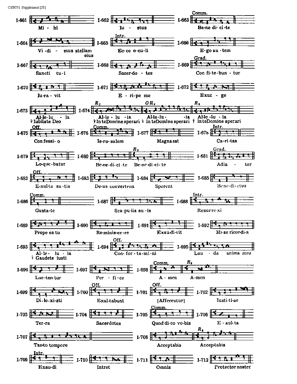[CSM7/1 Supplement:[26]; text: Alleluia Versus Laudate pueri, Alleluia Versus Laudate Dominum, Offertorium, Illumina, Tui sunt, Communio, Magna est, Pater, Introitus, Accipite, Tolite, Benedicimus, Respice in me, Domine, Circumdederunt me, Loqueber, Graduale, Propitius, Protector noster, Beatus vir, Diffusa est, Iustorum, Constitues, Ecce sacerdos, Ego dixi, Vindica domine, Adiuvabit, Ex Syon, Benedictus, Exiit sermo, Omnes, Qui operatus est, Fuit homo, Alleluia Versus Angelus Domini, Alleluia Versus Pie Pater, Alleluia Versus Primus ad Syon, Alleluia Versus Te martyrum, Sicut, Diffusa est, Populum, Iubilate, Intende, Dicit Dominus, Panem, Laetabitur iustus, Quinque prudentes, Laetare, Miserere, Ad Dominum, Tribulationes, Expectans, Circuibo, Domus mea, Non vos, Deus, Ecce deus, Anima nostra, Bonum est, Specie tua, Reges Tharsus, I-713, I-714, I-715, I-716, I-717, I-718, I-719, I-720, I-721, I-722, I-723, I-724, I-725, I-726, I-727, I-728, I-729, I-730, I-731, I-732, I-733, I-734, I-735, I-736, I-737, I-738, I-739, I-740, I-741, I-742, I-743, I-744, I-745, I-746, I-747, I-748, I-749, I-750, I-751, I-752, I-753, I-754, I-755, I-756, I-757, I-758, I-759, I-760, I-761, I-762, I-763, I-764, I-765, I-766, I-767, I-768]