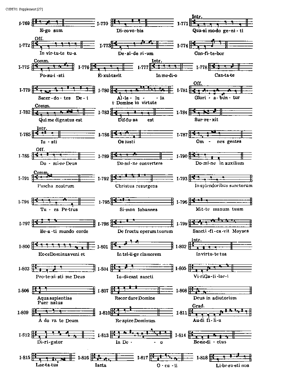 [CSM7/1 Supplement:[27]; text: Ego sum, Dico vobis, Introitus, Quasi modo geniti, Offertorium, In virtute tua, Desiderium, Confitebor, Communio, Posuisti, Exultavit, In medio, Cantate, Sacerdotes Dei, Alleluia Versus Domine in virtute, Gloriabuntur, Qui me dignatus est, Diffusa est, Surrexit, Iusti, Os iusti, Omnes gentes, Domine Deus, Domine convertere, Domine in auxilium, Pascha nostrum, Christus resurgens, In splendoribus sanctorum, Tu es Petrus, Simon Iohannes, Mitte manum tuum, Beati mundo corde, De fructu operum tuorum, Sanctificavit Moyses, Ecce Dominus veni et, Intellige clamorem, In virtute tua, Protexisti me Deus, Iudicant sancti, Viri Galilaei, Aqua sapientiae, Puer natus, Recordare Domine, Deus in adiutorium, Adorate Deum, Respice Dominum, Audi filia, Dirigatur, In Deo, Benedictus, Laetatus, Iacta, Oculi, Liberasti nos, I-769, I-770, I-771, I-772, I-773, I-774, I-775, I-776, I-777, I-778, I-779, I-780, I-781, I-782, I-783, I-784, I-785, I-786, I-787, I-788, I-789, I-790, I-791, I-792, I-793, I-794, I-795, I-796, I-797, I-798, I-799, I-800, I-801, I-802, I-803, I-804, I-805, I-806, I-807, I-808, I-809, I-810, I-811, I-812, I-813, I-814, I-815, I-816, I-817, I-818]