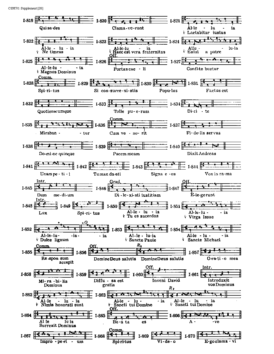 [CSM7/1 Supplement:[28]; text: Qui sedes, Clamaverunt, Alleluia Versus Laetabitur iustus, Alleluia Versus Ne timeas, Alleluia Versus Haec est vera fraternitas, Alleluia Versus Exiui a patre, Alleluia Versus Magnus Dominus, Offertorium, Portas caeli, Confitebuntur, Communio, Spiritus, Si consurrexistis, Populus, Factus est, Quotienscumque, Tolle puerum, Dicite, Mirabantur, Cum venerit, Fidelis servus, Domine quinque, Pacem meam, Dixit Andreas, Unam petii, Tu mandasti, Signa eos, Vox in rama, Introitus, Dum medium, Dilexisti iustitiam, Elegerunt, Lux, Alleluia Versus Tu es sacerdos, Alleluia Versus Virga Issae, Alleluia Versus Dulce lignum, Alleluia Versus Sancte Paule, Alleluia Versus Sancte Michael, Responsum accepit, Domine Deus salutis, Oratio mea, Mirabilis Dominus, Diffusa est gratia, Inveni David, Introduxit vos Dominus, Alleluia Versus Nimis honorati sunt, Alleluia Versus Sancti tui Domine, Alleluia Surrexit Dominus, Beata es, Ave, Improperium, Video, Ego clamavi, I-819, I-820, I-821, I-822, I-823, I-824, I-825, I-826, I-827, I-828, I-829, I-830, I-831, I-832, I-833, I-834, I-835, I-836, I-837, I-838, I-839, I-840, I-841, I-842, I-843, I-844, I-845, I-846, I-847, I-848, I-849, I-850, I-851, I-852, I-853, I-854, I-855, I-856, I-857, I-858, I-859, I-860, I-861, I-862, I-863, I-864, I-865, I-866, I-867, I-868, I-869, I-870]