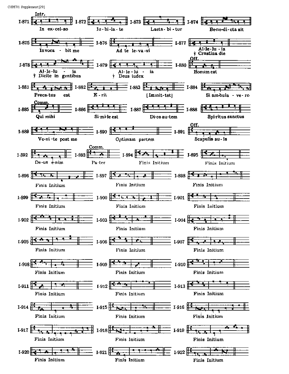 [CSM7/1 Supplement:[29]; text: Introitus, In excelso, Iubilate, Laetabitur, Benedicta sit, Invocabit me, Ad te levavi, Alleluia Versus Crastina die, Alleluia Versus Dicite in gentibus, Alleluia Versus Deus iudex, Offertorium, Bonum est, Precatus est, Erit, [Immittet], Si ambulavero, Communio, Qui mihi, Simile est, Dico autem, Spiritus sanctus, Venite post me, Optimam partem, Scapulis suis, Deus enim, Pater, Finis Initium, I-871, I-872, I-873, I-874, I-875, I-876, I-877, I-878, I-879, I-880, I-881, I-882, I-883, I-884, I-885, I-886, I-887, I-888, I-889, I-890, I-891, I-892, I-893, I-894, I-895, I-896, I-897, I-898, I-899, I-900, I-901, I-902, I-903, I-904, I-905, I-906, I-907, I-908, I-909, I-910, I-911, I-912, I-913, I-914, I-915, I-916, I-917, I-918, I-919, I-920, I-921, I-922]
